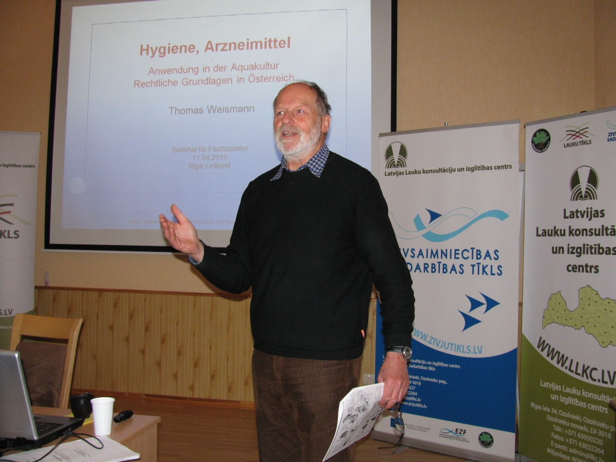 Turpinājumā ar lekciju uzstājās vieslektors Tomass Veismanis, kurš savu darbību jau 35 gadus saistījis, pētot zivju slimības Austrijas Zivju pētniecības institūtā (institūta mājaslapa – http://www.baw-igf.at/). Savu stāstījumu viņš papildināja ar fotogrāfijām, kas uzskatāmi parādīja katras apskatītās slimības pazīmes, ko iespējams novērot, apskatot zivis. Lektoram tika uzdoti dažādi jautājumi par zivju ārstniecību, iespējamo profilaksi zivju slimību gadījumā un higiēnu. Dažās no apskatītajām slimībām Latvijā nav novērotas, bet audzētājiem jābūt gataviem arī jaunu slimību gadījumu iespējamībai.