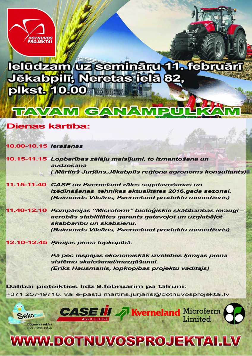 11 februārī, Jēkabpilī pulksten 10.00 sāksies seminārs par lopbarības zālājiem un to audzēšanu, lopbarības sagatavošanas tehniku, un piena lopkopībā nepieciešamajiem dezinfekcijas līdzekļiem