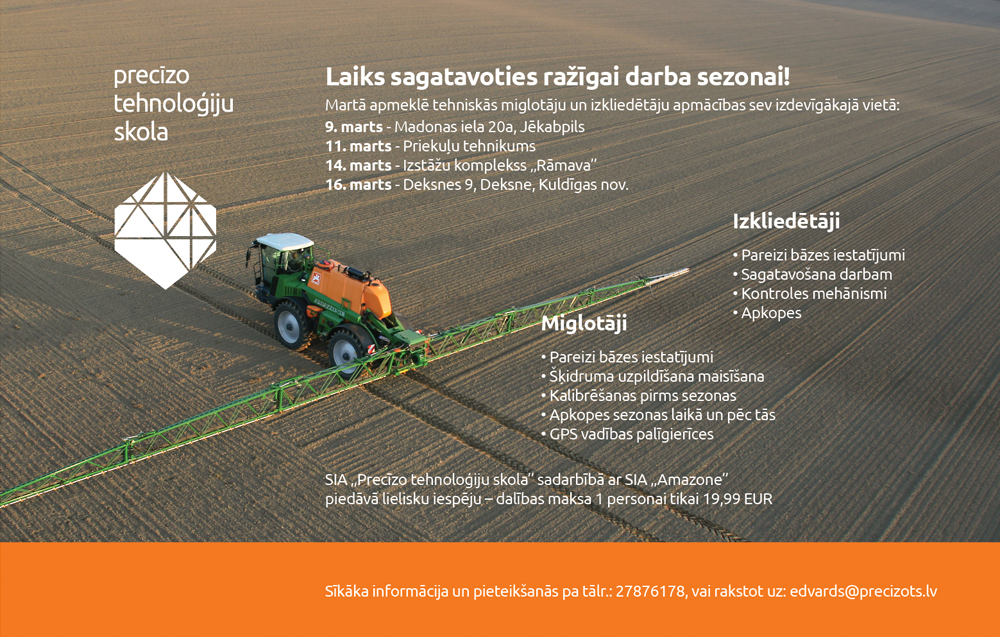 SIA ''Precīzo tehnloloģiju skola'' sadarbībā ar SIA "Amazone'' piedāvā lielisku iespēju apmeklēt tehniskās miglotāju un izkliedētāju apmācības.
