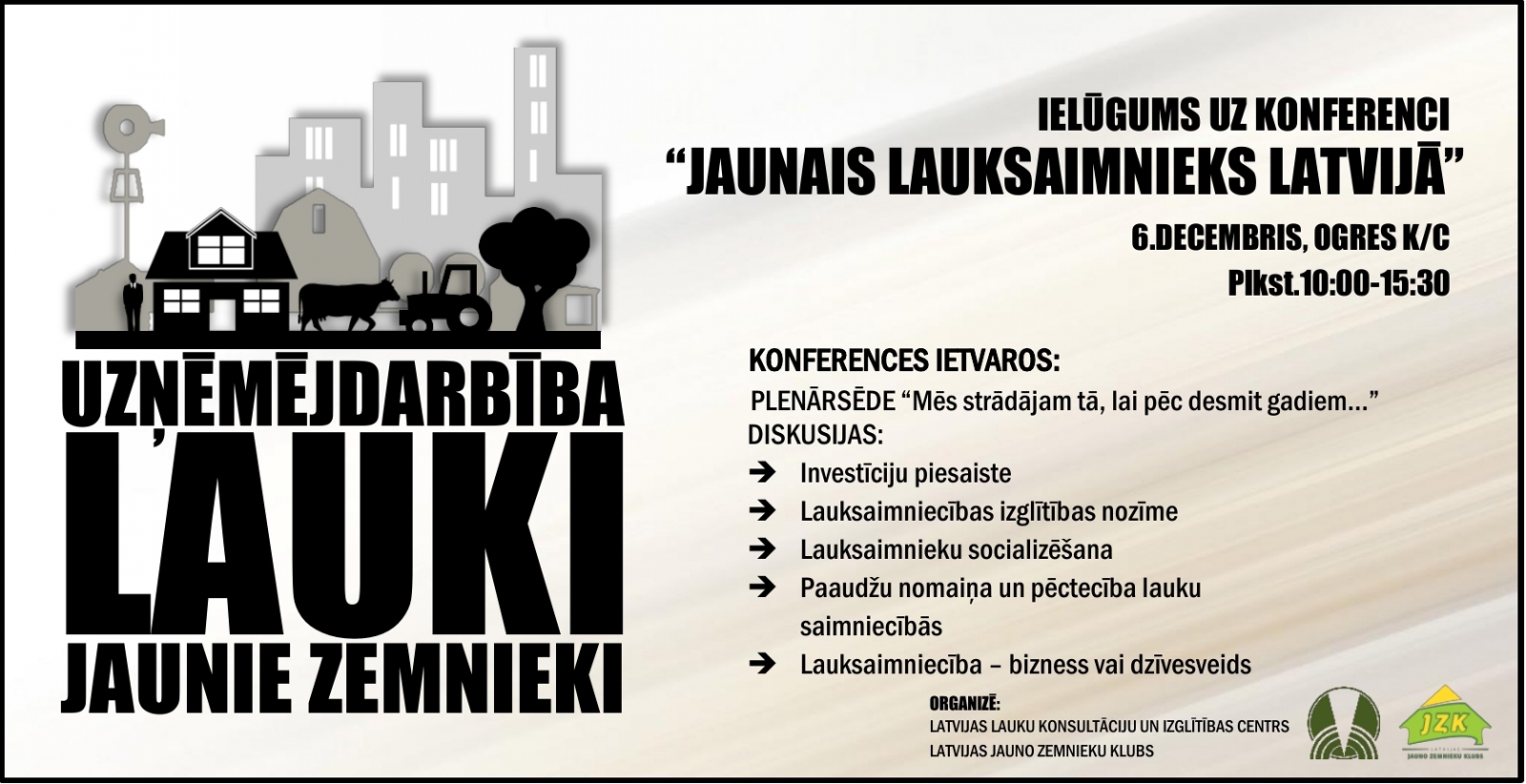 Latvijas Lauku konsultāciju un izglītības centrs sadarbībā ar Latvijas Jauno zemnieku klubu 6. decembrī organizē konferenci “Jaunais lauksaimnieks Latvijā”. Konferences mērķis ir veicināt jauno lauksaimnieku sadarbību un ietekmi dažādās lēmējinstitūcijās Latvijā, kā arī rosināt diskusiju starp lauksaimniekiem un dažādām tiem saistošām organizācijām.