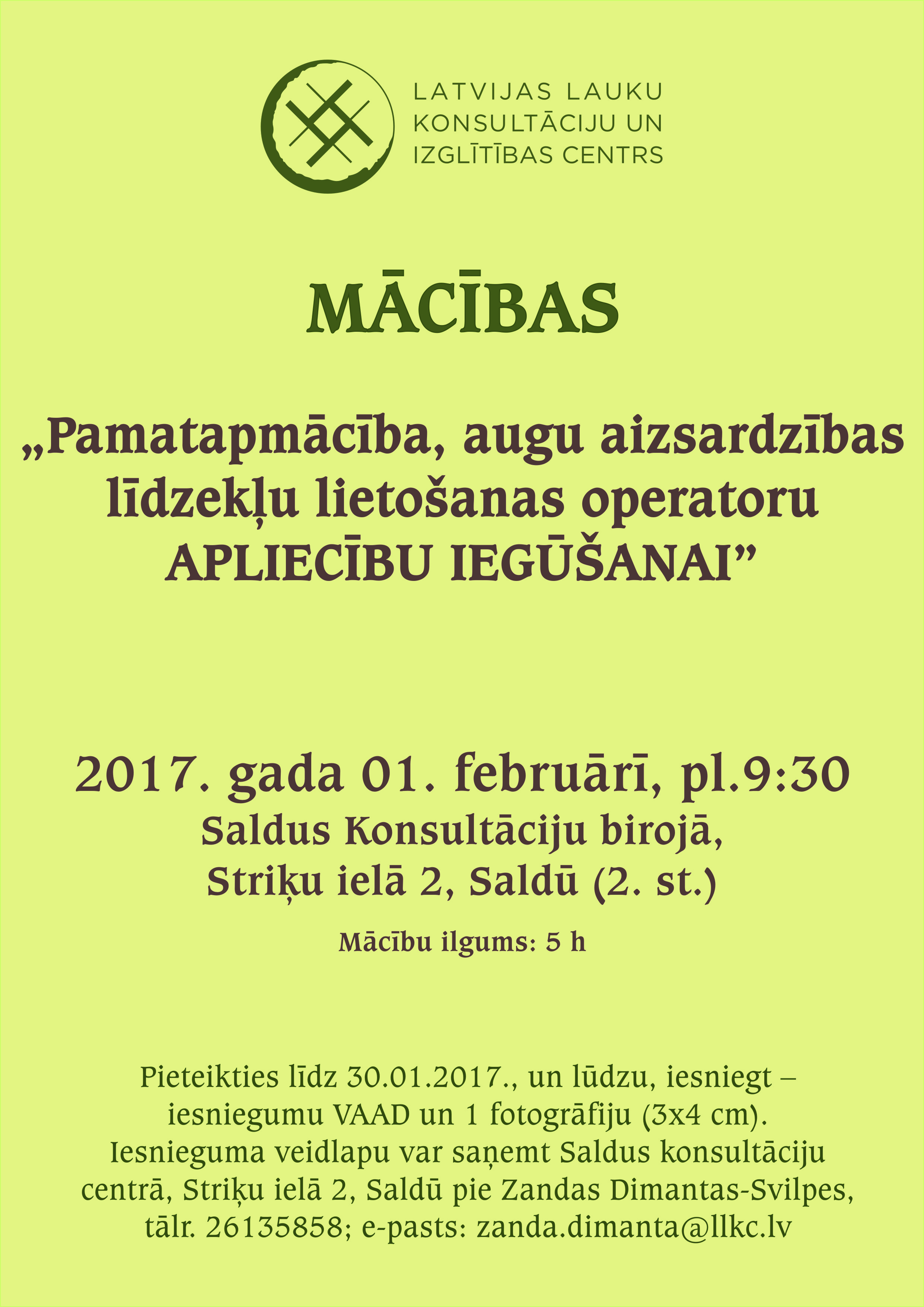 Pieteikties līdz 30.01.2017., un lūdzu, iesniegt – iesniegumu VAAD un 1 fotogrāfiju (3x4 cm). Iesnieguma veidlapu var saņemt Saldus konsultāciju centrā, Striķu ielā 2, Saldū pie Zandas Dimantas-Svilpes, tālr. 26135858; e-pasts: zanda.dimanta@llkc.lv