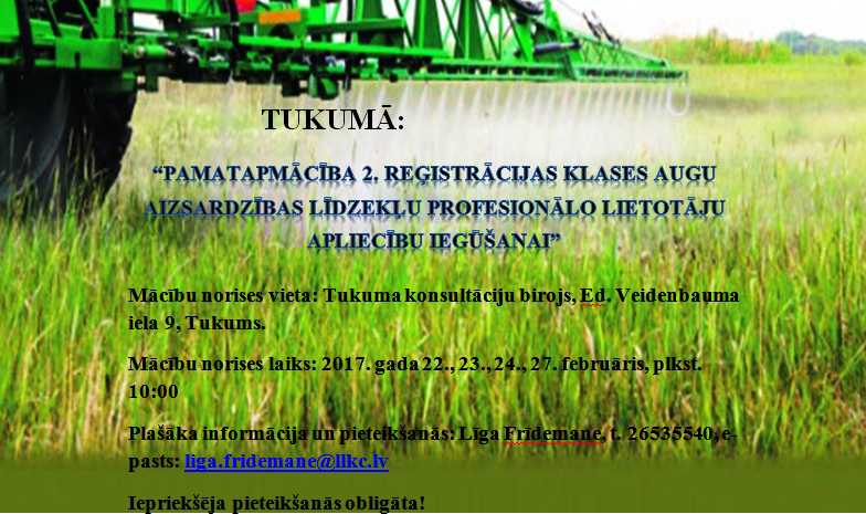 Tukumā pamatapmācība 2. reģistrācijas klases augu aizsardzības līdzekļu profesionālo lietotāju apliecības iegūšanai