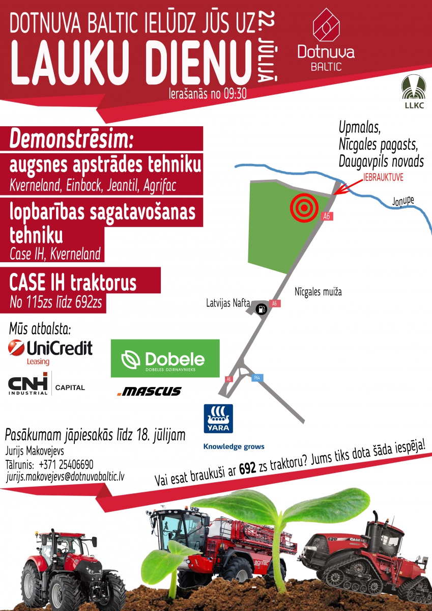 SIA “Dotnuva Baltic” ielūdz Jūs apmeklēt CASE, Kverneland, Einbock un citu ražotāju tehnikas demonstrācijas pasākumu “Lauku diena ” Daugavpils novada, Nīcgales pagasta, Upmalās, š.g. 22.jūlijā.