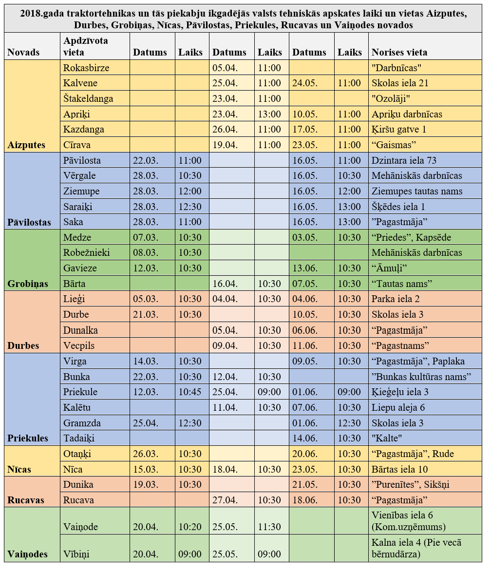 Traktortehnikas un tās piekabju ikgadējās valsts tehniskās apskates laiki - Aizputes, Durbes, Grobiņas, Nīcas, Pāvilostas, Priekules, Rucavas un Vaiņodes novads.