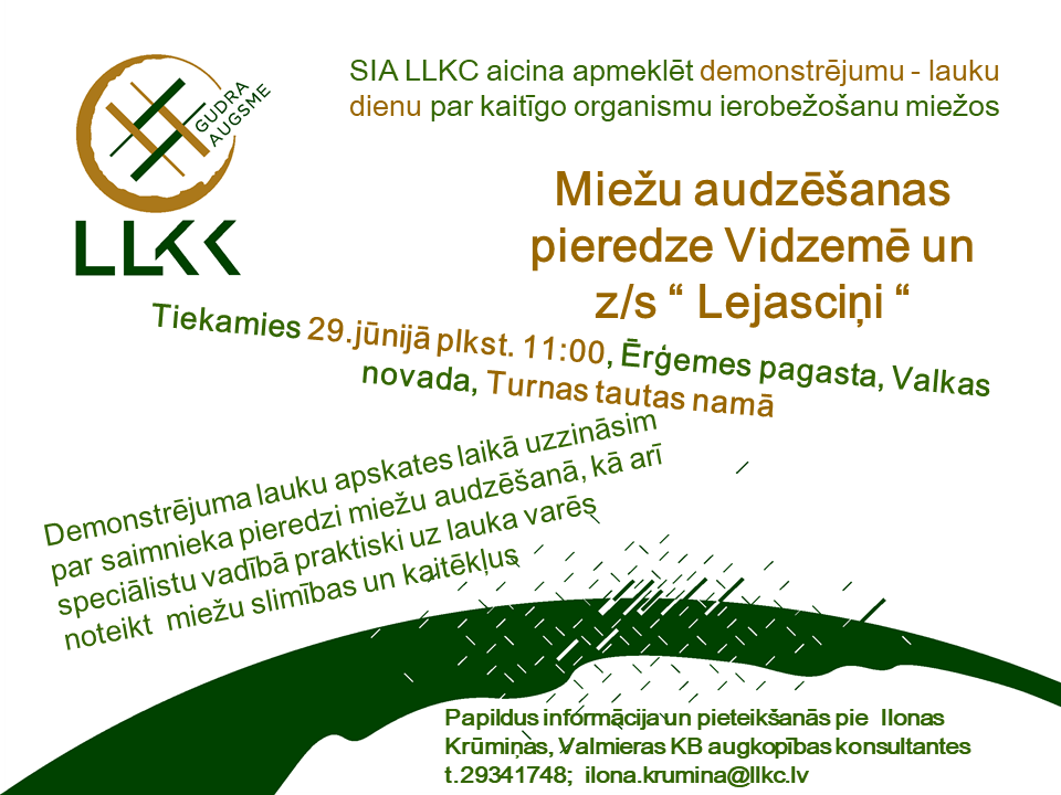 2018.gada 29.jūnijā pulksten. 11:00 Ērģemes pagasta Turnas tautas namā LLKC aicina apmeklēt lauku dienu -demonstrējumu " Laukaugiem kaitīgo organismu ierobežošana dažādos Latvijas reģionos", par tematu - miežu audzēšanas tehnoloģijas un slimību ierobežošanas iespējas
