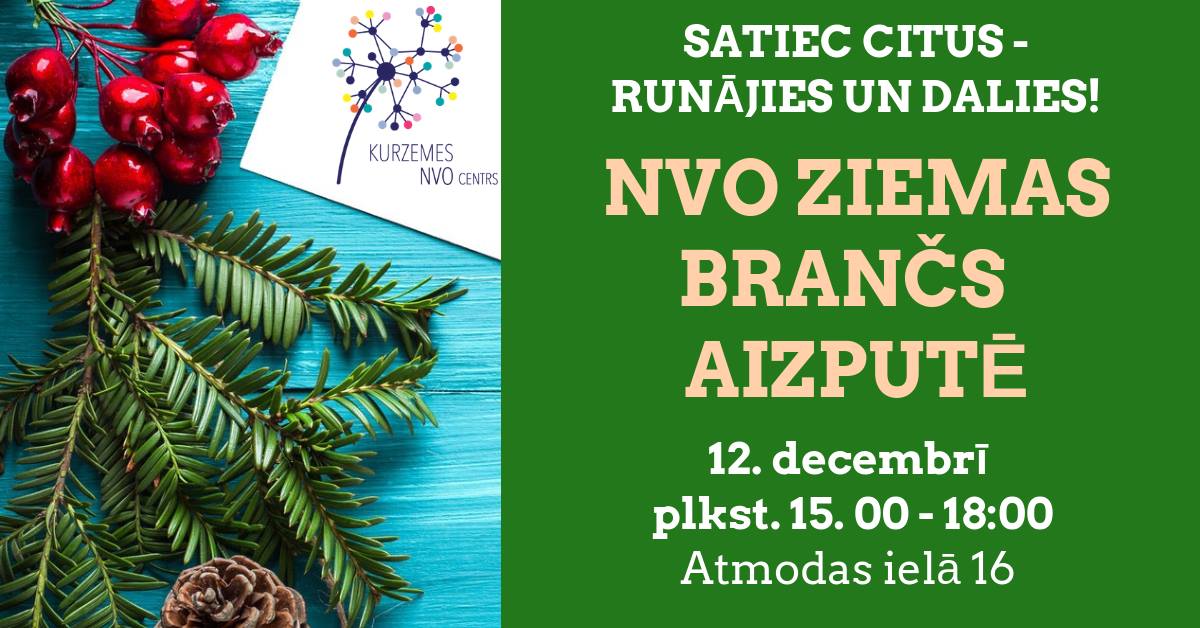Kurzemes NVO centrs, sadarbībā ar Aizputes novada pašvaldību ielūdz aktīvos aizputniekus (biedrību, nodibinājumu pārstāvjus vai vienkārši aktīvistus) 12.decembrī plkst. 15:00 – 18:00 Aizputes novada Tūrisma informācijas un Mūžizglītības centra (Atmodas iela 16, Aizpute) telās uz Aizputes NVO ziemas branču jeb nesteidzīgu tikšanos draugu logā našķējoties ar kārumiem!