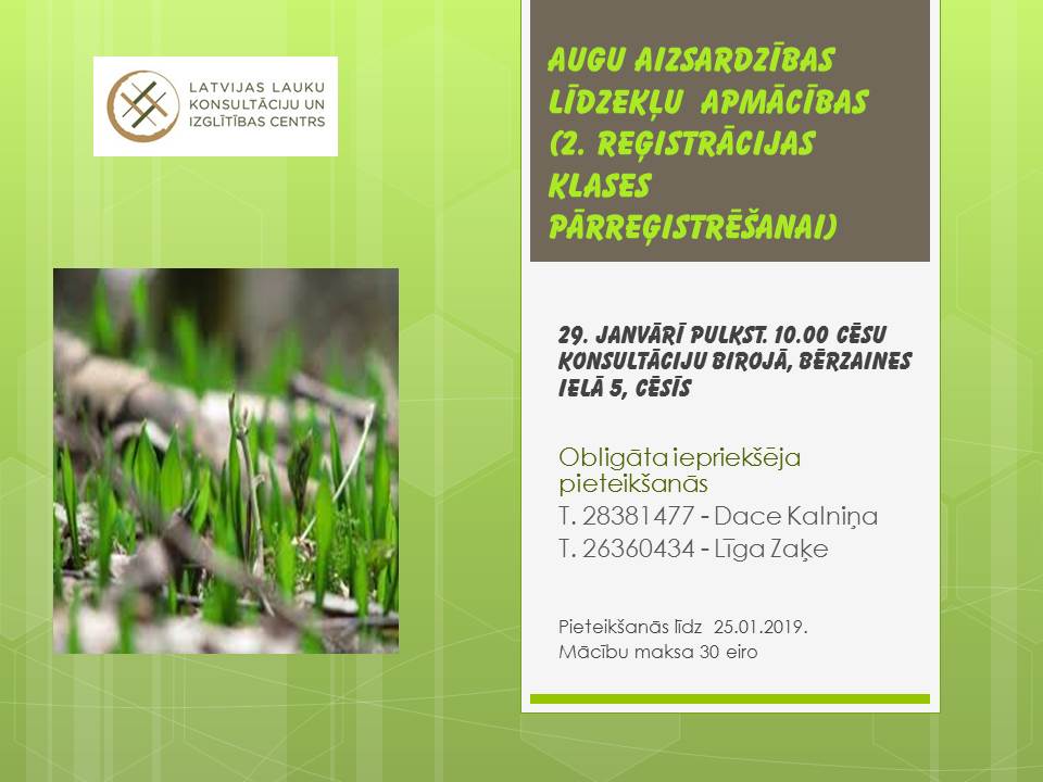 LLKC Cēsu konsultāciju birojs rīko mācības "Zināšanu atjaunošana 2.reģistrācijas klases augu aizsardzības līdzekļu profesionālo lietotāju apliecību pārreģistrēšanai".