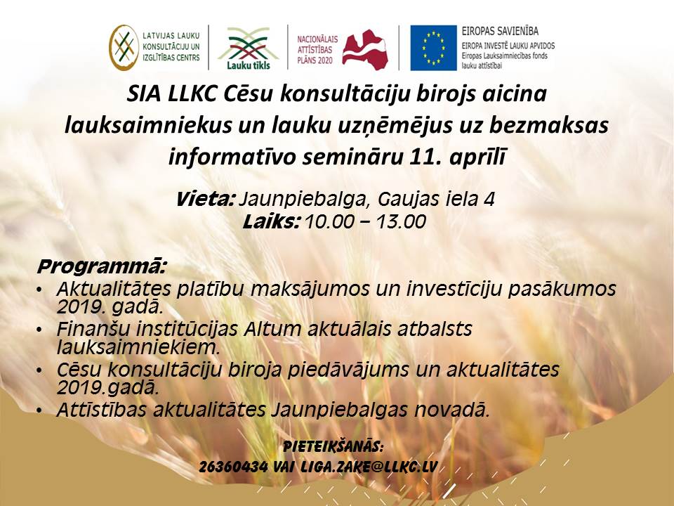 LLKC Cēsu nodaļa 2019. gada 11. aprīlī, Jaunpiebalgā, Gaujas ielā 4, pulksten 10.00 - 13.00 rīko informatīvo semināru lauksaimniekiem par Lauku attīstības programmas aktualitātēm, pasākumiem un finansējuma piesaisti.