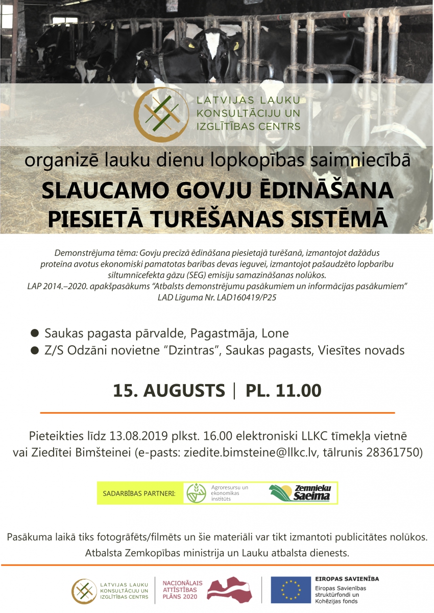 Lauka diena notiks 15. augustā divās daļās no plkst. 11 līdz 15 Saukas pagasta pārvaldē un z/s “Odzāni”, Saukas pagasts, Viesītes novads. Lauka dienā būs iespēja uzzināt par slaucamo govju precīzu ēdināšanu ģimenes saimniecībās, kur slaucamās govis apsaimnieko novietnēs ar piesieto turēšanu. Kā labāk un pareizāk ēdināt govis, lai ierobežotu SEG emisijas apkārtējā vidē, saglabājot un palielinot ražošanas rādītājus piena lopkopībā. Saimniecības īpašnieki dalīsies ar savu pieredzi un iecerēm.