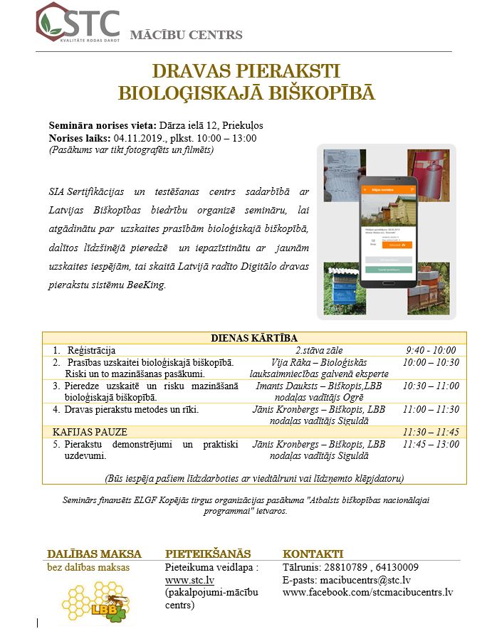 SIA “Sertifikācijas un testēšanas centrs” sadarbībā ar Latvijas Biškopības biedrību organizē semināru, lai atgādinātu par uzskaites prasībām bioloģiskajā biškopībā, dalītos līdzšinējā pieredzē un iepazīstinātu ar jaunām uzskaites iespējām, tai skaitā Latvijā radīto Digitālo dravas pierakstu sistēmu BeeKing.