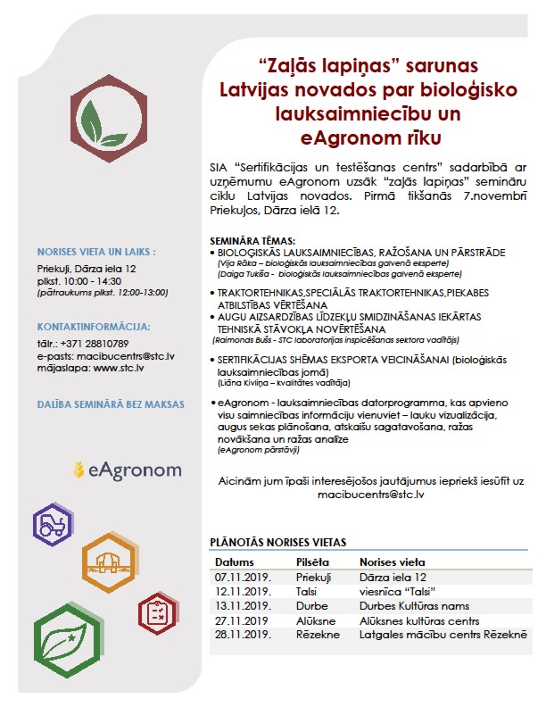 SIA “Sertifikācijas un testēšanas centrs” sadarbībā ar uzņēmumu eAgronom uzsāk “zaļās lapiņas” semināru ciklu Latvijas novados.