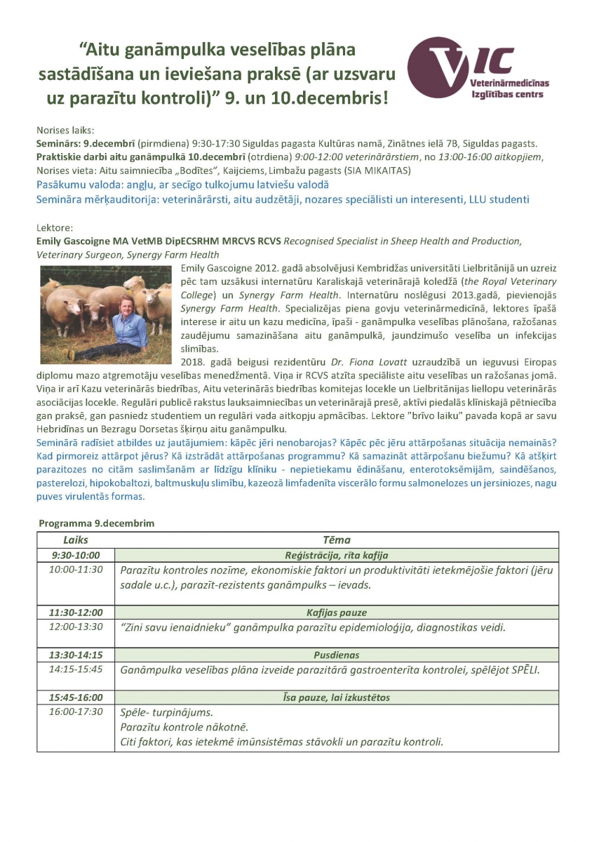 Latvijā pirmo reizi viesosies Kembridžas universitātes absolvente, viena no nedaudzajiem Lielbritānijā strādājošiem Eiropas veterinārārstiem - diplomātiem aitu ganāmpulka veselībā un menedžmentā - veterinārārste Emily Gascoigne MA VetMB DipECSRHM MRCVS RCVS, lai dalītos ar savām zināšanām ar mums - Latvijas veterinārārstiem, aitu audzētājiem, VMF studentiem un mācībspēkiem.