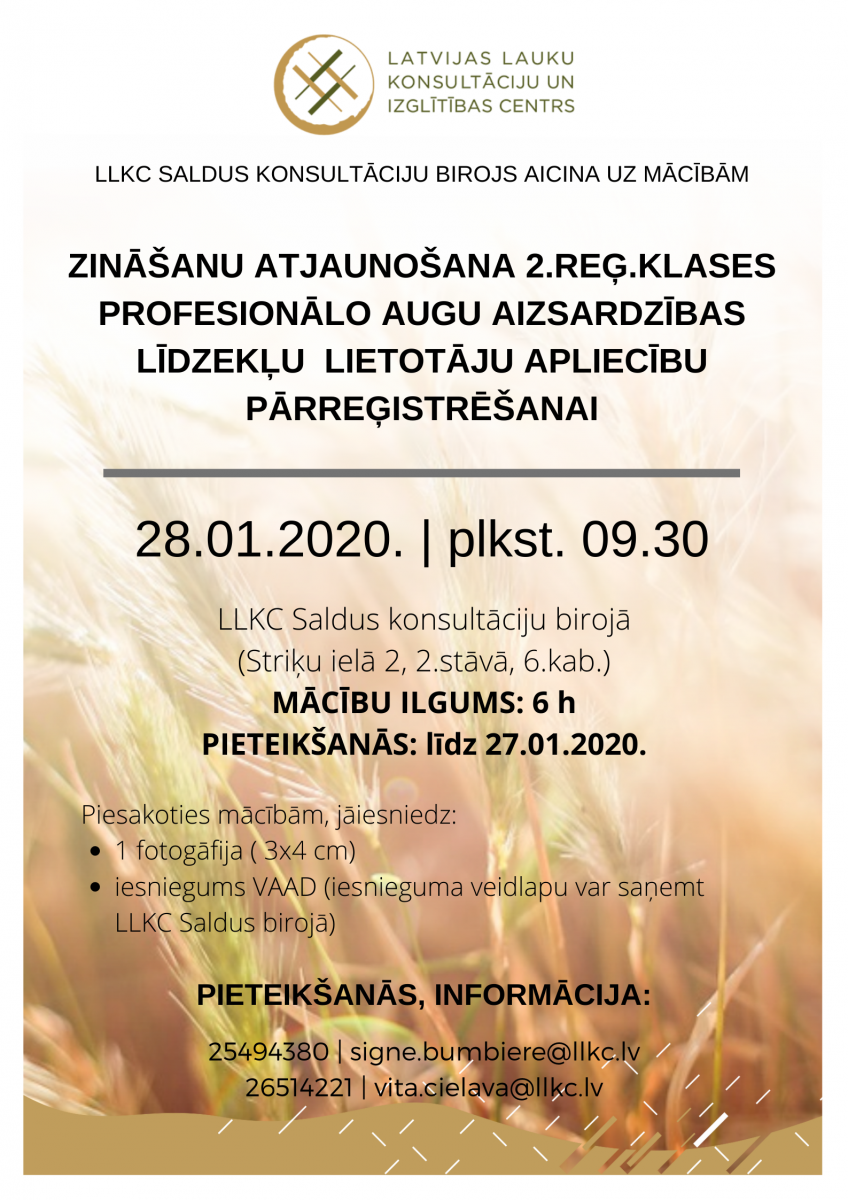 LLKC Saldus konsultāciju birojs organizē mācības "Zināšanu atjaunošana 2.reģistrācijas klases augu aizsardzības līdzekļu profesionālo lietotāju apliecību PĀRREĢISTRĒŠANAI".