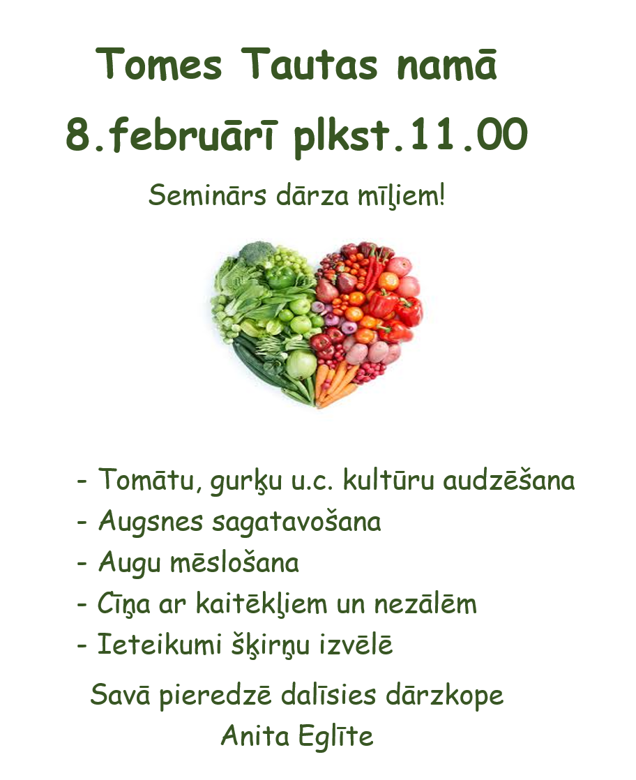 Datums: 8. Februāris, 2020Adrese: Skatīt karti lielākā izmērā Nozare: LauksaimniecībaTomes Tautas namā 8.februārī plkst. 11.00 seminārs dārza mīļiem Kontaktinformācija: Tomes Tautas namsReģions filtram: * Ķeguma novads