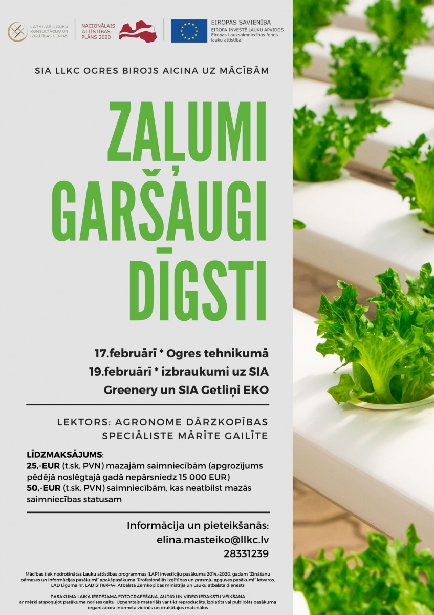SIA LLKC Ogres birojs aicina uz mācībām “Kvalitatīvas un ekonomiski izdevīgas augkopības produkcijas ražošana” par zaļumiem, garšaugiem, dīgstiem jeb mikrozaļumiem, kā arī gurķiem.