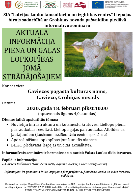 SIA “Latvijas Lauku konsultāciju un izglītības centrs” Liepājas birojs sadarbībā ar Grobiņas novada pašvaldību piedāvā informatīvo semināru AKTUĀLA INFORMĀCIJA PIENA UN GAĻAS LOPKOPĪBAS JOMĀ STRĀDĀJOŠAJIEM.