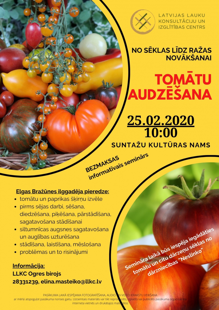 SIA LLKC Ogres birojs 25.02.2020 Suntažu kultūras namā 10:00 rīko informatīvu BEZMAKSAS semināru "TOMĀTU AUDZĒŠANA - no sēklas līdz ražas novākšanai". Pārbaudītas vērtības, aktualitātes un jaunākās tendences.