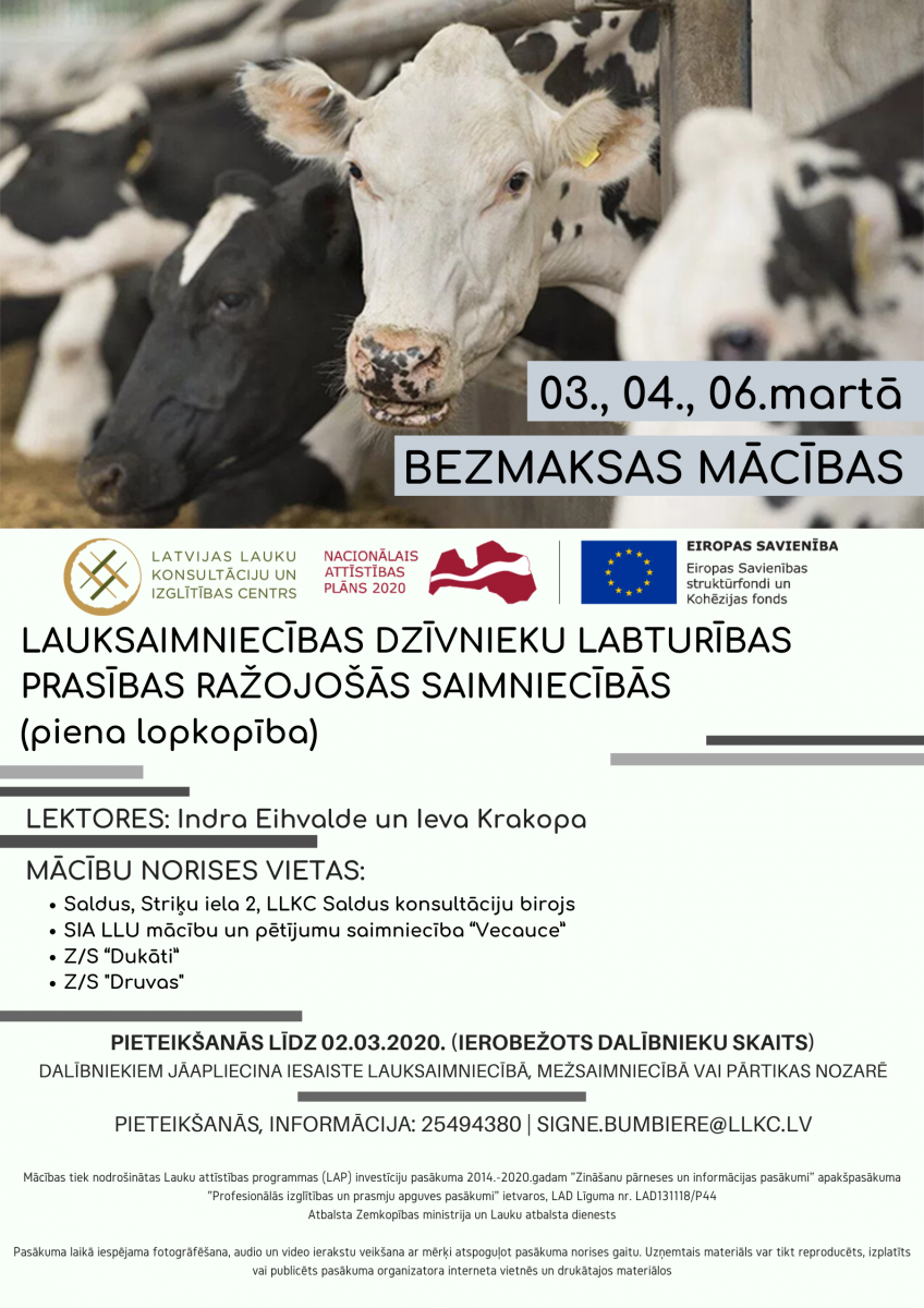 LLKC Saldus konsultāciju birojs aicina Jūs apmeklēt bezmaksas mācības “Lauksaimniecības dzīvnieku labturības prasības ražojošās saimniecībās” (piena lopkopība).