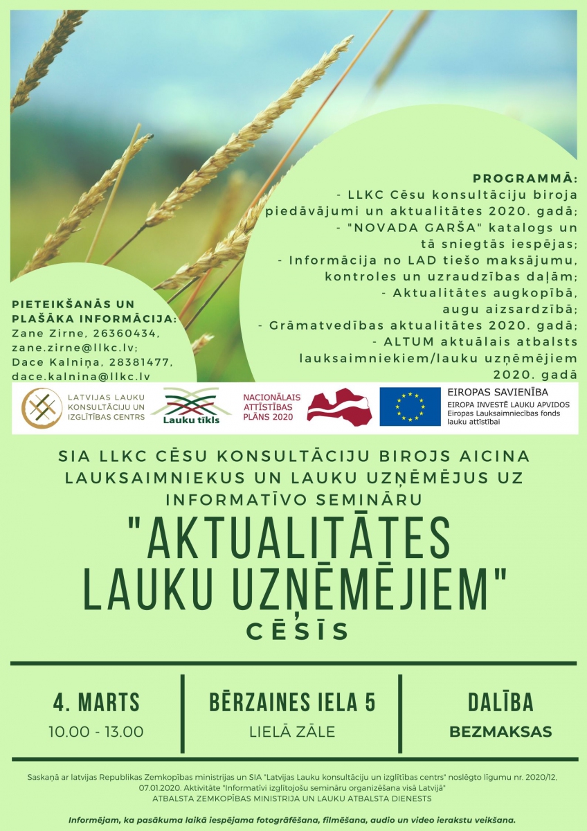 LLKC Cēsu konsultāciju birojs aicina lauksaimniekus un lauku uzņēmējus uz bezmaksas informatīvo semināru "Aktualitātes lauku uzņēmējiem", kas norisināsies 4. martā plkst. 10.00 Cēsīs, Bērzaines ielā 5.
