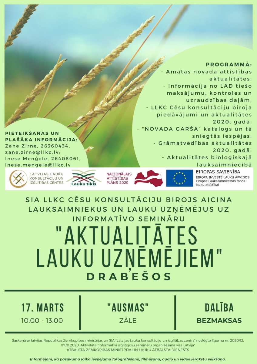 LLKC Cēsu konsultāciju birojs aicina lauksaimniekus un lauku uzņēmējus uz bezmaksas informatīvo semināru "Aktualitātes lauku uzņēmējiem", kas norisināsies 17. martā plkst. 10.00 Drabešos, "Ausmās".