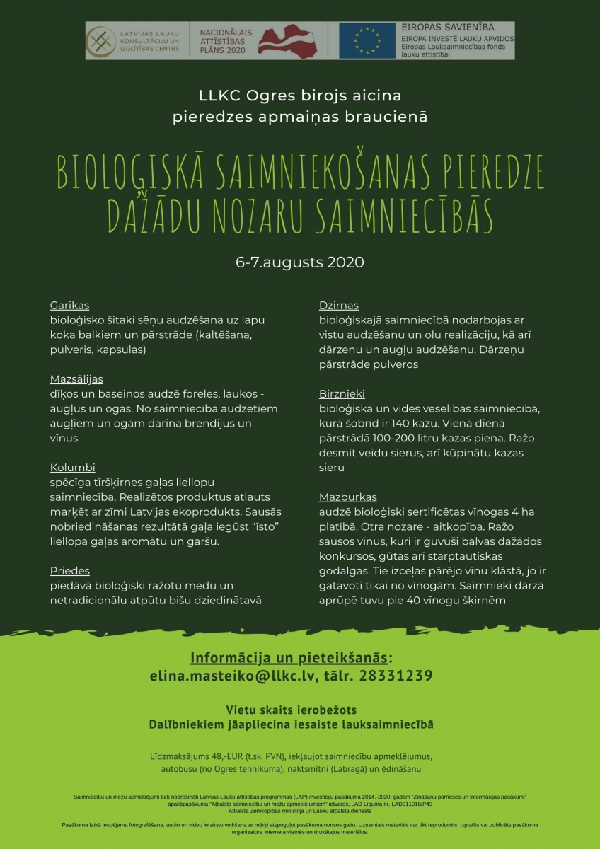 LLKC Ogres birojs aicina pieredzes apmaiņas braucienā uz Kurzemi – “Bioloģiskā saimniekošanas pieredze dažādu nozaru saimniecībās, bioloģiskās lauksaimniecības pievienotās vērtības palielināšana un realizācijas iespējas” 6-7.augustā.
