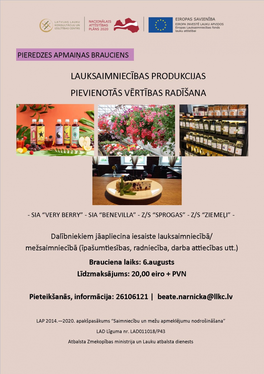 Šī gada 6.augustā SIA LLKC Ludzas birojs organizē pieredzes apmaiņas braucienu uz Alūksnes novada saimniecībām. Brauciens tiek organizēts LAP 2014. - 2020. apakšpasākuma "Saimniecību un mežu apmeklējumu nodrošināšana" ietvaros. LAD līguma nr. LAD011018/P43. Atbalsta Zemkopības ministrijas un Lauku atbalsta dienests.