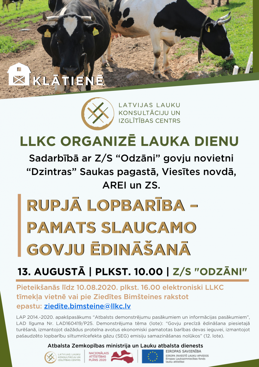 LLKC organizē lauka dienu ģimenes piensaimniecībā par rupjo lopbarību kā pamatbarību slaucamo govju ēdināšanā un tās novērtēšanas kritērijiem. Būs iespēja vairāk uzzināt par piena sastāva rādītājiem, tos ietekmējošiem faktoriem. Pasākums notiks 13. augustā pulksten 10 Saukas pagasta pārvaldē (Pagastmāja, Lone), vēlāk z/s “Odzāni” novietnē “Dzintras” (Saukas pagastā, Viesītes novadā).
