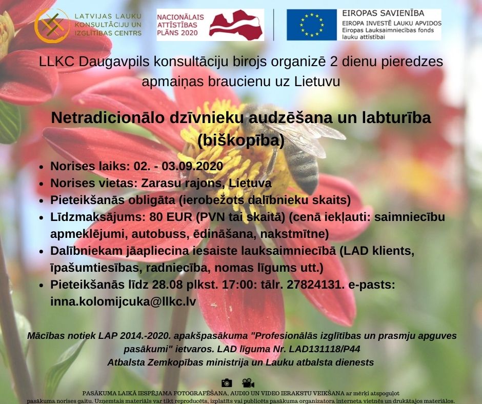 SIA LLKC Daugavpils KB organizē 2 dienu pieredzes apmaiņas braucienu uz Lietuvu par tēmu "Netradicionālo dzīvnieku audzēšana un labturība (biškopība)". Brauciens tiek organizēts LAP 2014.-2020. apakšpasākuma "Saimniecību un mežu apmeklējuma nodrošināšana" ietvaros.