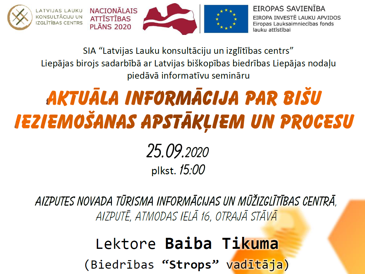 2020. gada 25. septembrī plkst. 15:00 bezmaksas informatīvu seminārs "Aktuāla informācija par bišu ieziemošanas apstākļiem un procesu" Aizputes novada Tūrisma informācijas un mūžizglītības centrā (Aizputē, Atmodas ielā 16, otrajā stāvā).