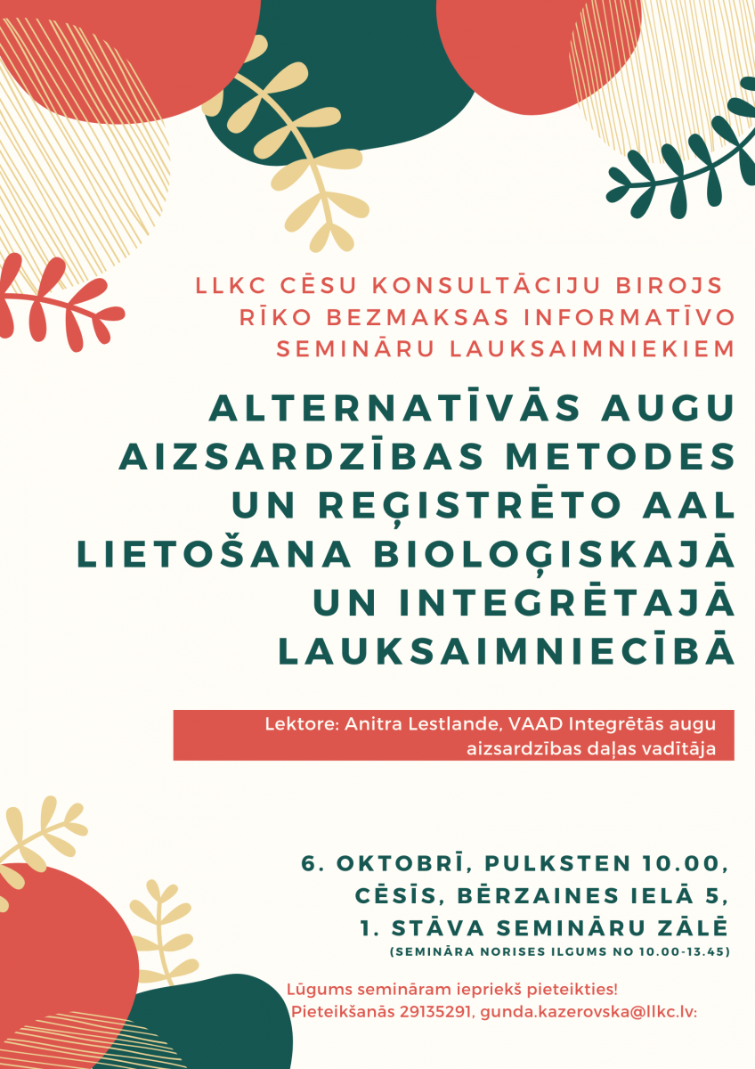 LLKC Cēsu konsultāciju birojs rīko informatīvo semināru lauksaimniekiem "Alternatīvās augu aizsardzības metodes un reģistrēto AAL lietošana bioloģiskajā un integrētajā lauksaimniecībā".
