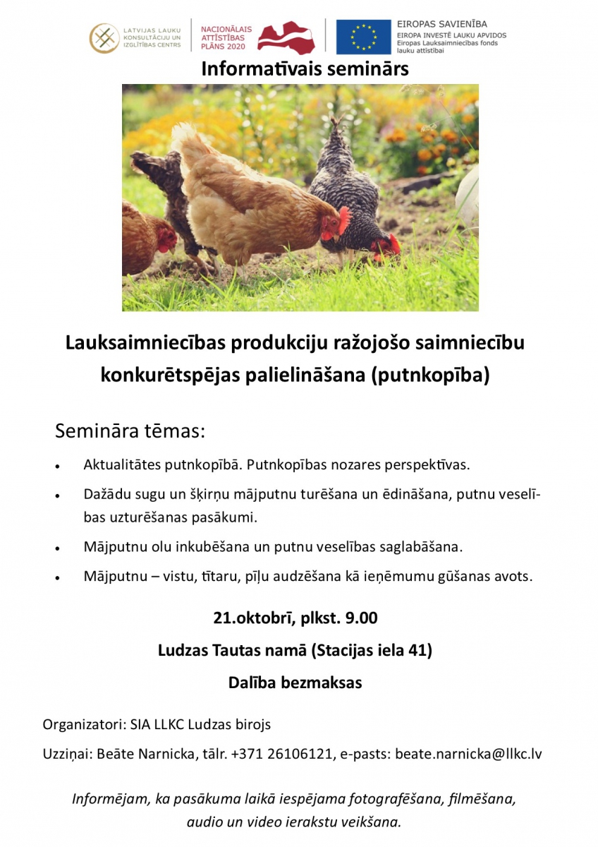 Šī gada 21.oktobrī SIA LLKC Ludzas birojs organizē informatīvo semināru "Lauksaimniecības produkciju ražojošo saimniecību konkurētspējas palielināšana (putnkopība)". Seminārā tiks sniegta informācija par aktualitātēm putnkopībā, putnkopības nozares perspektīvēm, dažādu sugu un šķirņu mājputnu turēšanas un ēdināšanas, putnu veselības uzturēšanas pasākumiem, mājputnu olu inkubēšanu un putnu veselības saglabāšanu, kā arī mājputnu – vistu, tītaru, pīļu audzēšanu kā ieņēmumu gūšanas avotu.