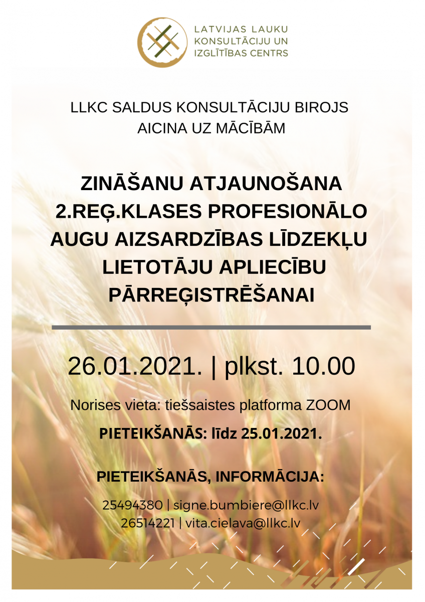LLKC Saldus konsultāciju birojs organizē mācību kursu "Zināšanu atjaunošana 2.reģ.klases profesionālo augu aizsardzības līdzekļu lietotāju apliecību pārreģistrēšanai".