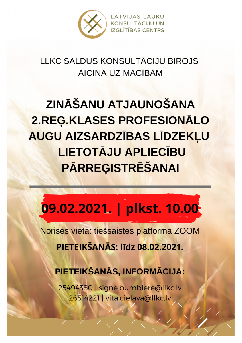 LLKC Saldus konsultāciju birojs organizē mācību kursu "Zināšanu atjaunošana 2.reģ.klases profesionālo augu aizsardzības līdzekļu lietotāju apliecību pārreģistrēšanai".
