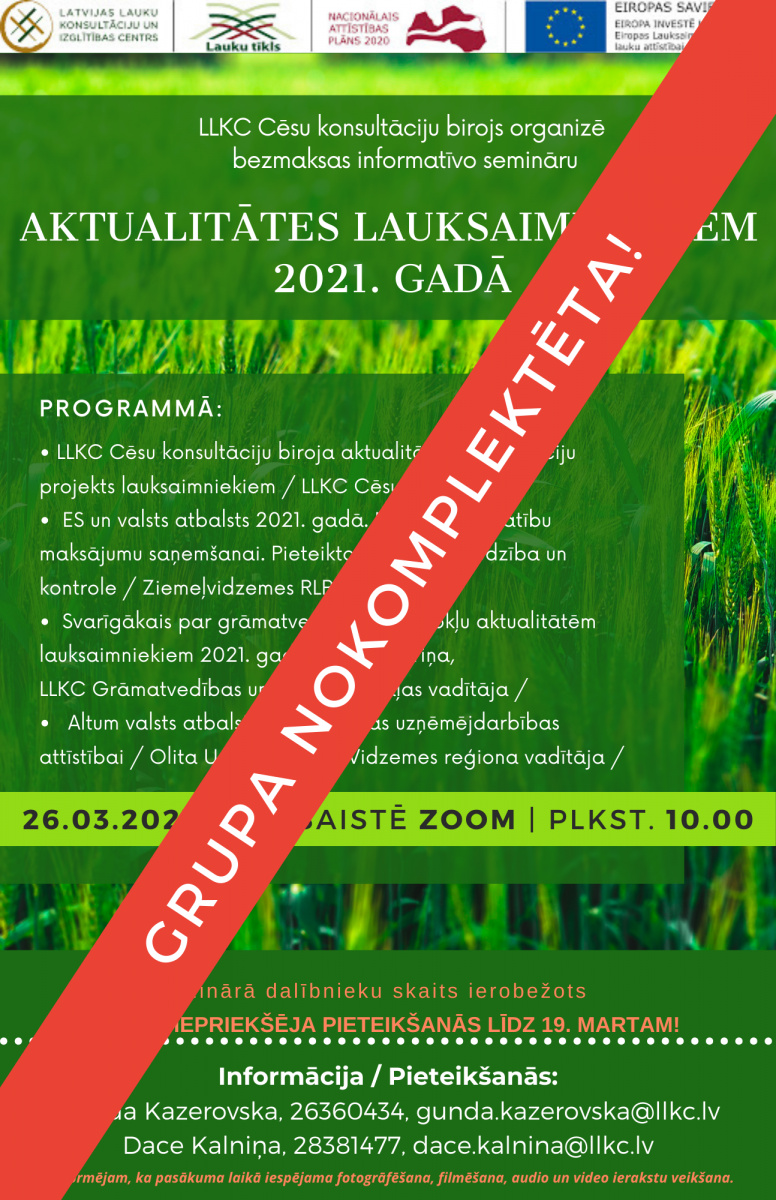 LLKC Cēsu konsultāciju birojs rīko bezmaksas informatīvo semināru “Aktualitātes lauksaimniekiem 2021. gadā”.