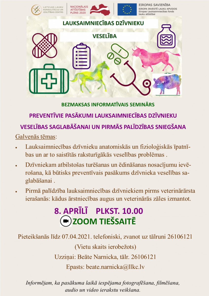 Šī gada 8.aprīlī SIA LLKC Ludzas birojs ZOOM platformā organizē bezmaksas informatīvo semināru "Preventīvie pasākumi lauksaimniecības dzīvnieku veselības saglabāšanai un pirmās palīdzības sniegšana".