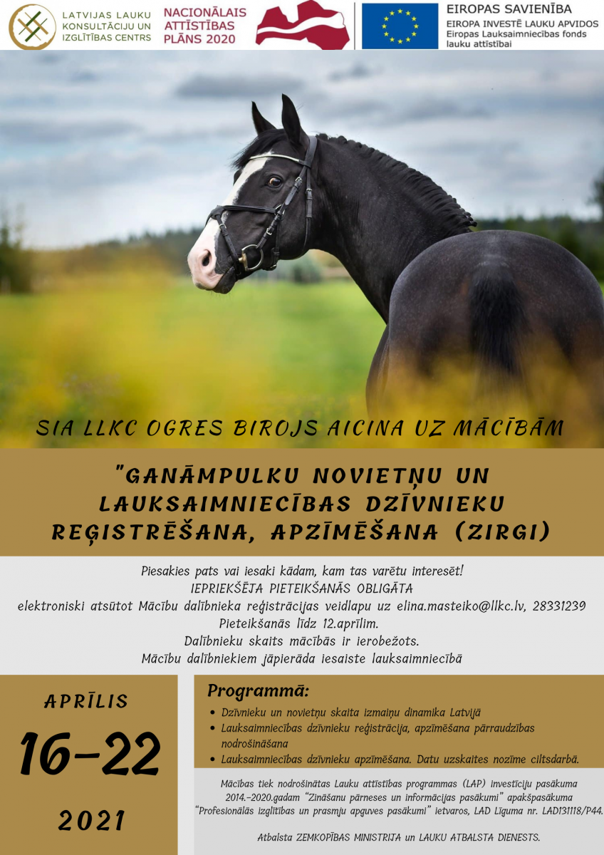 SIA LLKC Ogres birojs aicina uz bezmaksas mācībām “Ganāmpulku novietņu un lauksaimniecības dzīvnieku reģistrēšana, apzīmēšana” par ZIRGIEM