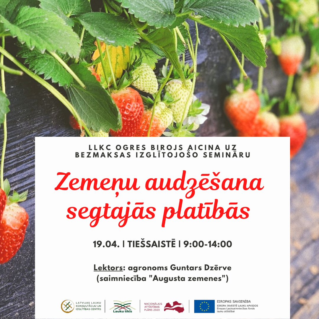 SIA LLKC Ogres konsultāciju birojs 2021. gada 19.aprīlī plkst. 09.00-14.00 aicina piedalīties Valsts Lauku tīkla aktivitāšu ietvaros rīkotajā bezmaksas izglītojošā seminārā „Zemeņu audzēšana segtajās platībās” tiešsaistes vidē agronoma Guntara Dzērves vadībā, kā arī papildus gūstot praktisko pieredzi, tiešsaistē viesojoties saimniecības “Augusta zemenes” siltumnīcās.