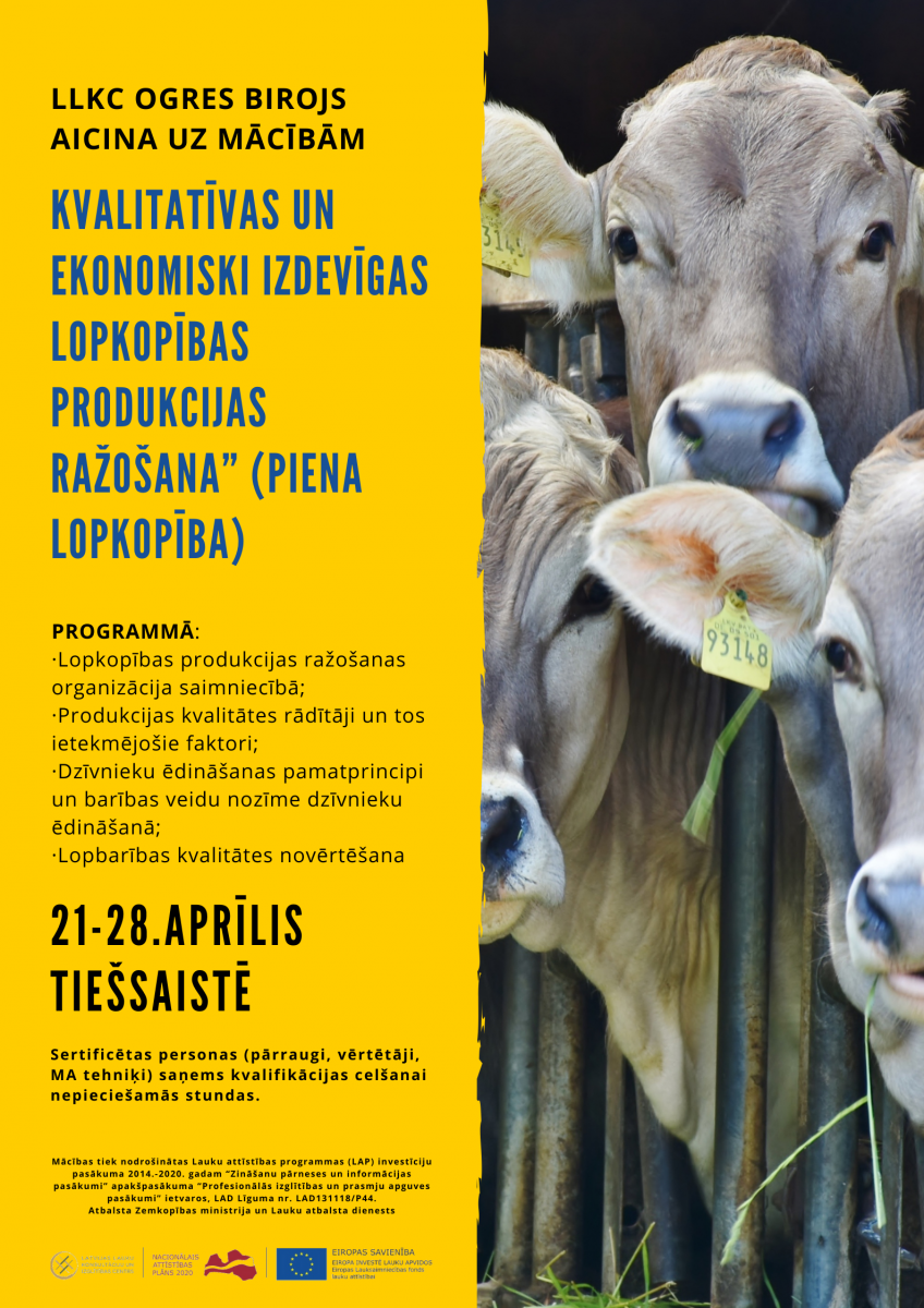 SIA LLKC Ogres birojs aicina uz mācībām “Kvalitatīvas un ekonomiski izdevīgas lopkopības produkcijas ražošana” (piena lopkopība).