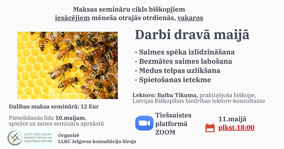 LLKC Jelgavas konsultāciju birojs aicina uz semināru ciklu mēneša otro otrdienu vakaros biškopjiem iesācējiem par aktuālajiem darbiem dravā.
