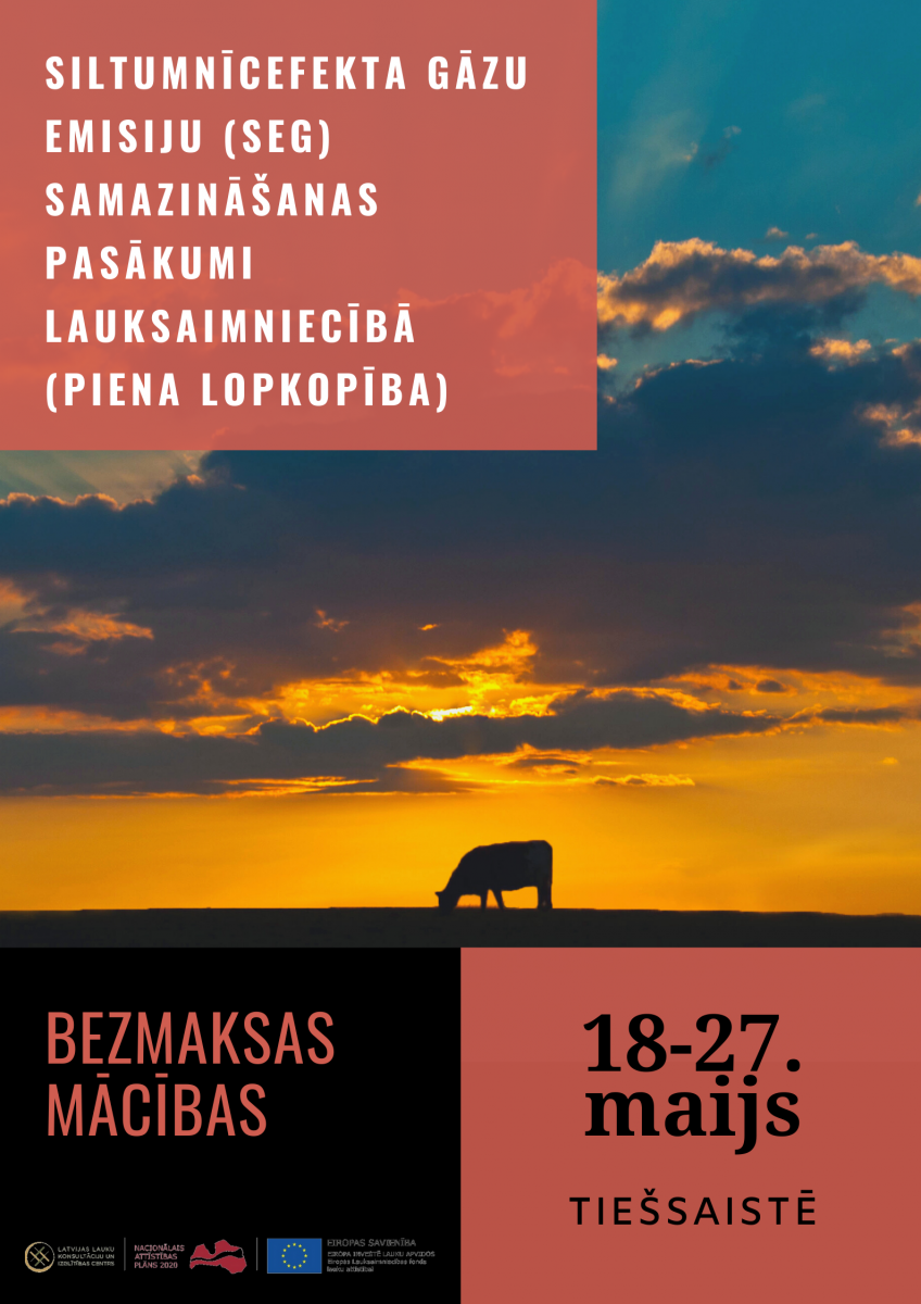 SIA LLKC Ogres birojs aicina lauksaimniekus uz bezmaksas mācībām “Emisiju samazināšanas pasākumi lauksaimniecībā (piena lopkopība). Izmaksu efektīvie siltumnīcefekta gāzu emisiju (SEG) ierobežojošie pasākumi ražošanas energoefektivitātes uzlabošanai un SEG samazināšanai uz produkcijas vienību”