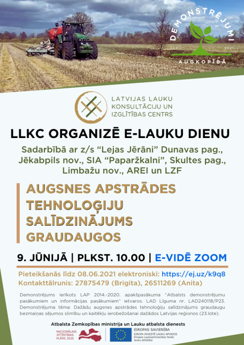 e-Lauku dienā būs iespēja uzzināt saimniecību pieredzi, izmantojot dažādas augsnes apstrādes tehnoloģijas graudaugu audzēšanā, iegūt informāciju par demonstrējuma rezultātiem un lēmumu pieņemšanu ziemas kviešu slimību ierobežošanā.