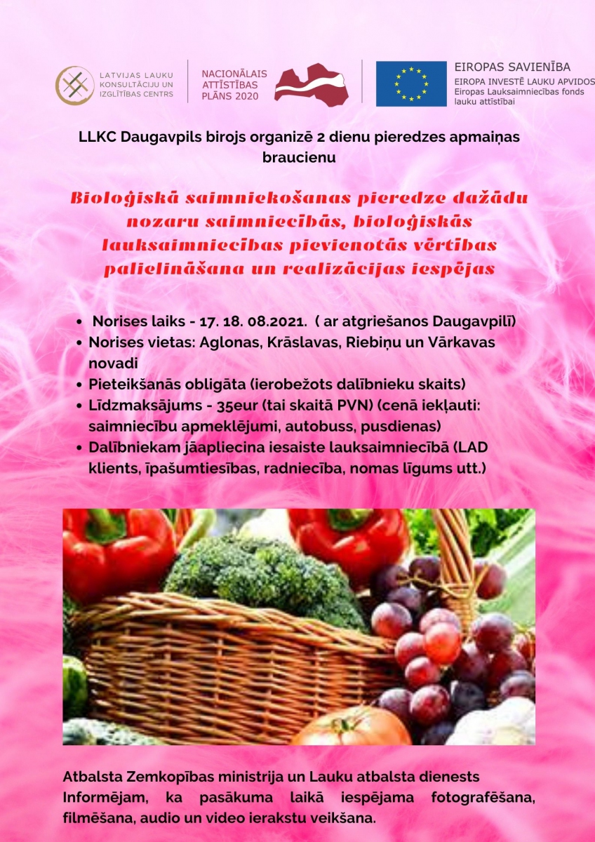 SIA LLKC Daugavpils KB organizē 2 dienu (ar atgriešanos Daugavpilī) pieredzes apmaiņas braucienu par tēmu "Bioloģiskā saimniekošanas pieredze dažādu nozaru saimniecībās, bioloģiskās lauksaimniecības pievienotās vērtības palielināšana un realizācijas iespējas". Brauciens tiek organizēts LAP 2014.-2020. apakšpasākuma "Saimniecību un mežu apmeklējuma nodrošināšana" ietvaros.