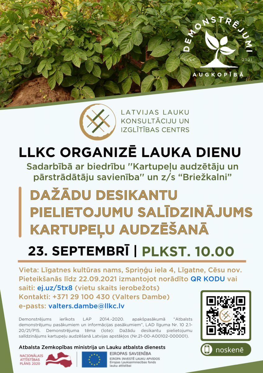 LLKC sadarbībā ar biedrību ''Kartupeļu audzētāju un pārstrādātāju savienība'' un z/s “Briežkalni” Cēsu novadā aicina apmeklēt demonstrējuma lauka dienu par desikantu pielietojuma salīdzinājumu kartupeļu stādījumā.