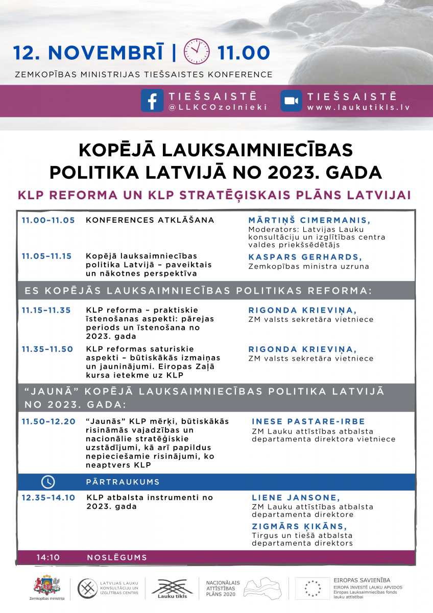 Konference 12. novembrī būs skatāma www.laukutikls.lv, kā arī LLKC Facebook kontā. Konferences sākums – pulksten 11.00. Programma – pielikumā.