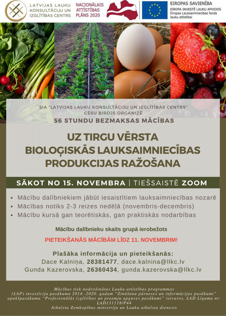 LLKC Cēsu konsultāciju birojs organizē 56 stundu bezmaksas mācības “Uz tirgu vērsta bioloģiskās lauksaimniecības produkcijas ražošana”.