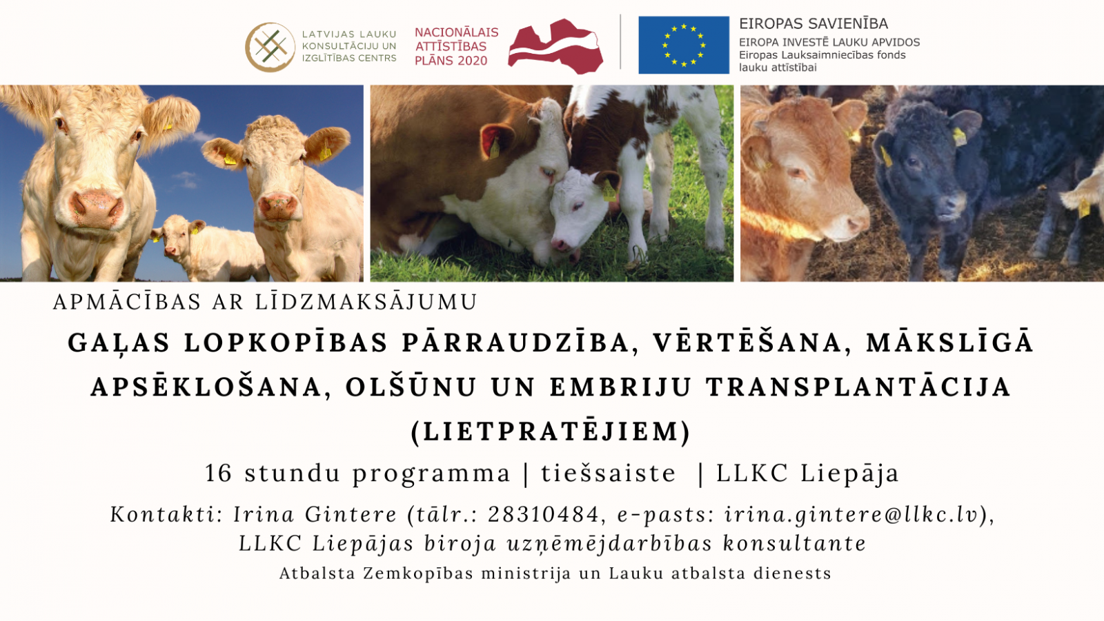 LLKC Liepājas birojs piedāvā apmācības gaļas lopkopībā ar līdzmaksājumu tiešsaistes (ZOOM) vidē. Apmācības tiek īstenotas Lauku attīstības programmas ietvaros un iekļauj gan teorētiskās, gan praktiskās stundas, kas nozīmē aktīvu mācību dalībnieku līdzdalību.
