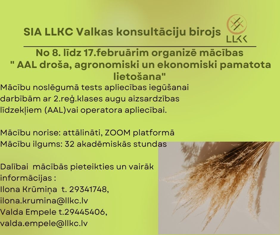 Valkas konsultāciju birojs aicina pievienoties mācībām, kuras sāksies 8.februārī - "Augu aizsardzības līdzekļu droša, agronomiski un ekonomiski pamatota lietošana" (Programma ar līdzmaksājumu)