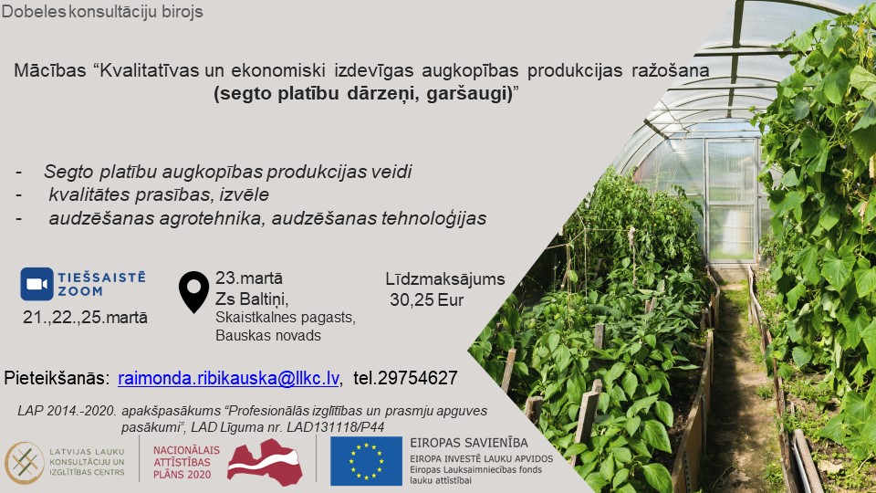 LLKC Dobeles birojs organizē 4 dienu mācības "Kvalitatīvas un ekonomiski izdevīgas augkopības produkcijas ražošana (segto platību dārzeņi, garšaugi) "