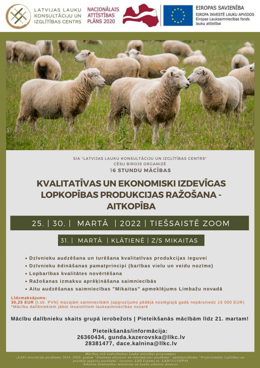 LLKC Cēsu konsultāciju birojs aicina uz mācībām "Kvalitatīvas un ekonomiski izdevīgas lopkopības produkcijas ražošana -aitkopība".