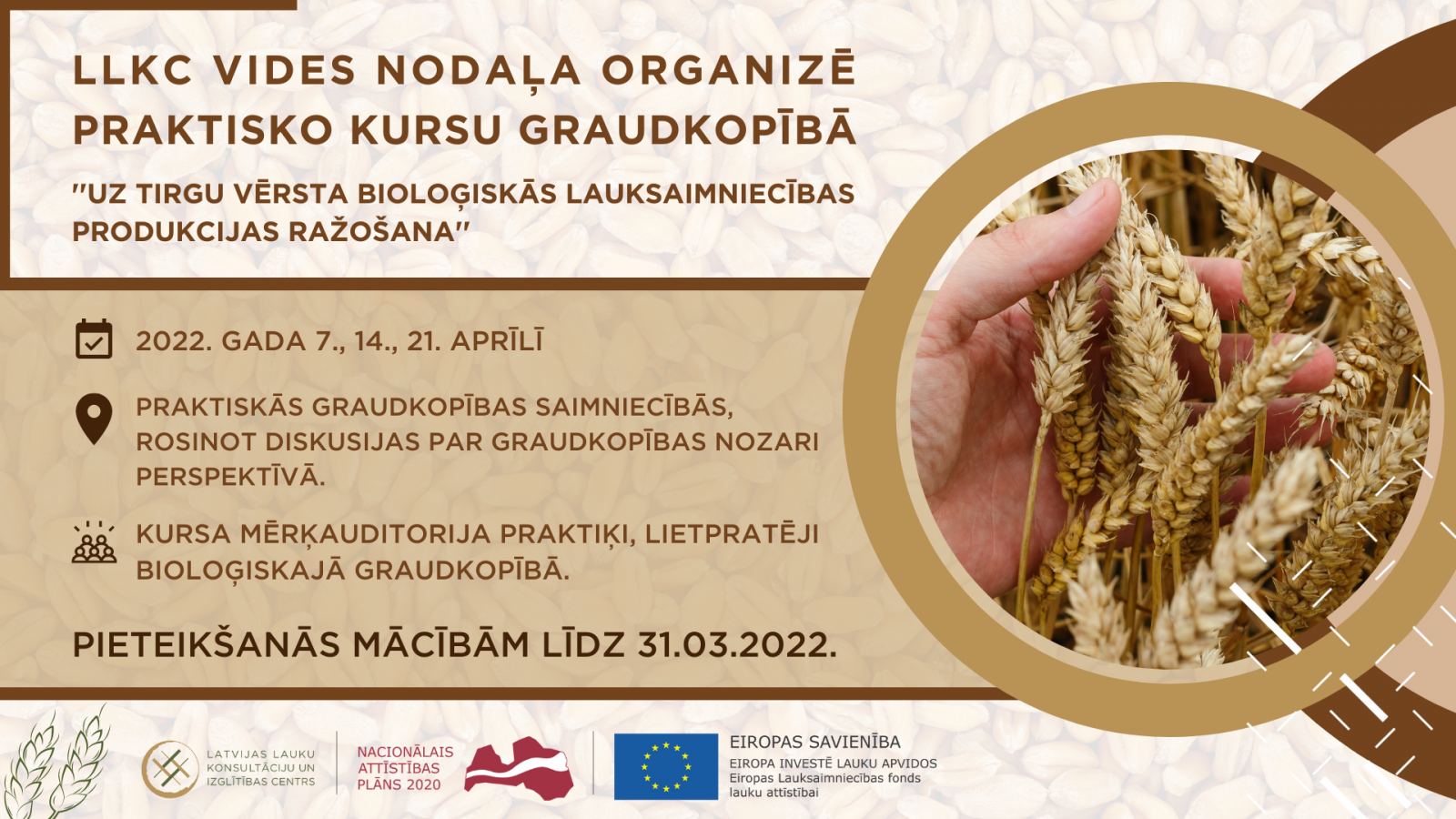 LLKC Vides nodaļa sadarbībā ar graudkopības saimniecībām organizē mācības nozares praktiķiem par bioloģisko graudkopību. Mācību laikā apmeklēsim Latvijas bioloģiskās saimniecības “Ķelmēni, “Amatnieki” un “Kalnakaļvi”.